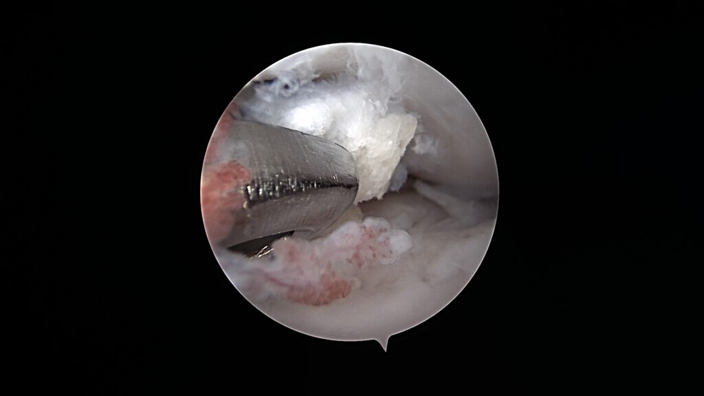 Sur le plan diagnostique, l’arthroscopie permet de confirmer la rupture partielle ou complète du ligament croisé, d’apprécier les lésions associées et de poser une indication chirurgicale adaptée. Sur le plan thérapeutique, elle permet notamment le traitement des lésions méniscales, avec le retrait ciblé des lambeaux méniscaux instables, ainsi que l’élimination des débris ligamentaires intra-articulaires.