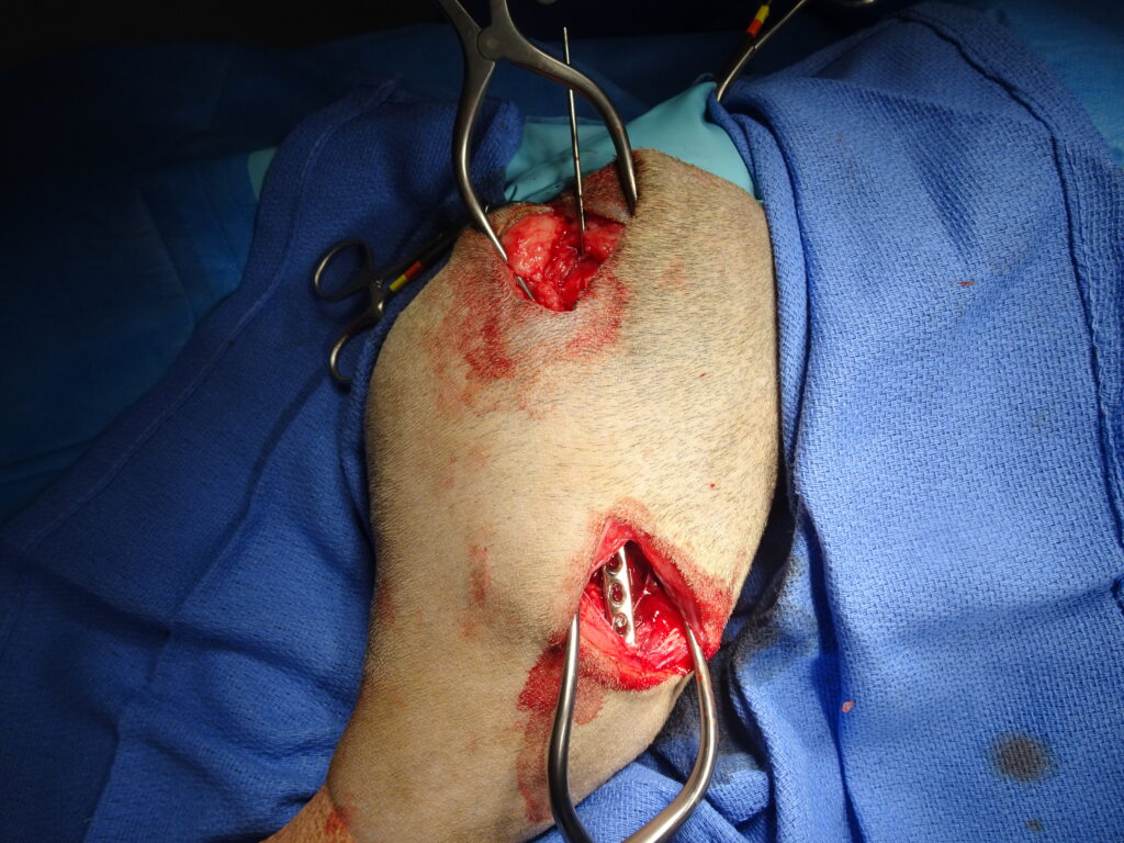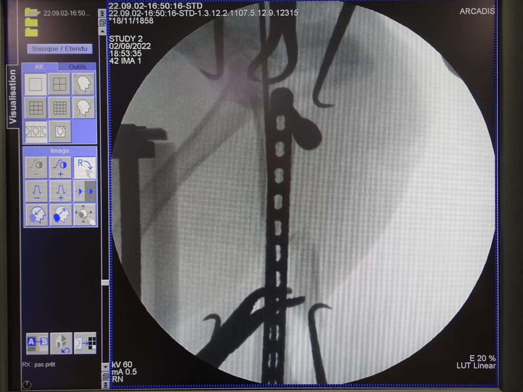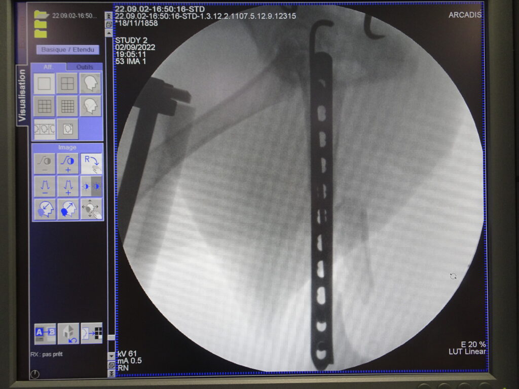 Stabilisation d’une fracture du fémur par voie mini invasive grâce à la fluoroscopie.