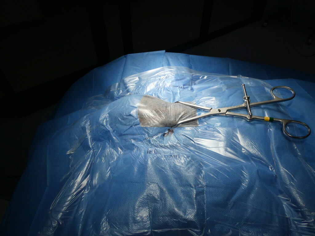 Réduction d’une luxation sacro-iliaque sur un chat par voie mini invasive. Une sis canulée est introduite de manière percutanée avec une ouverture minimale.