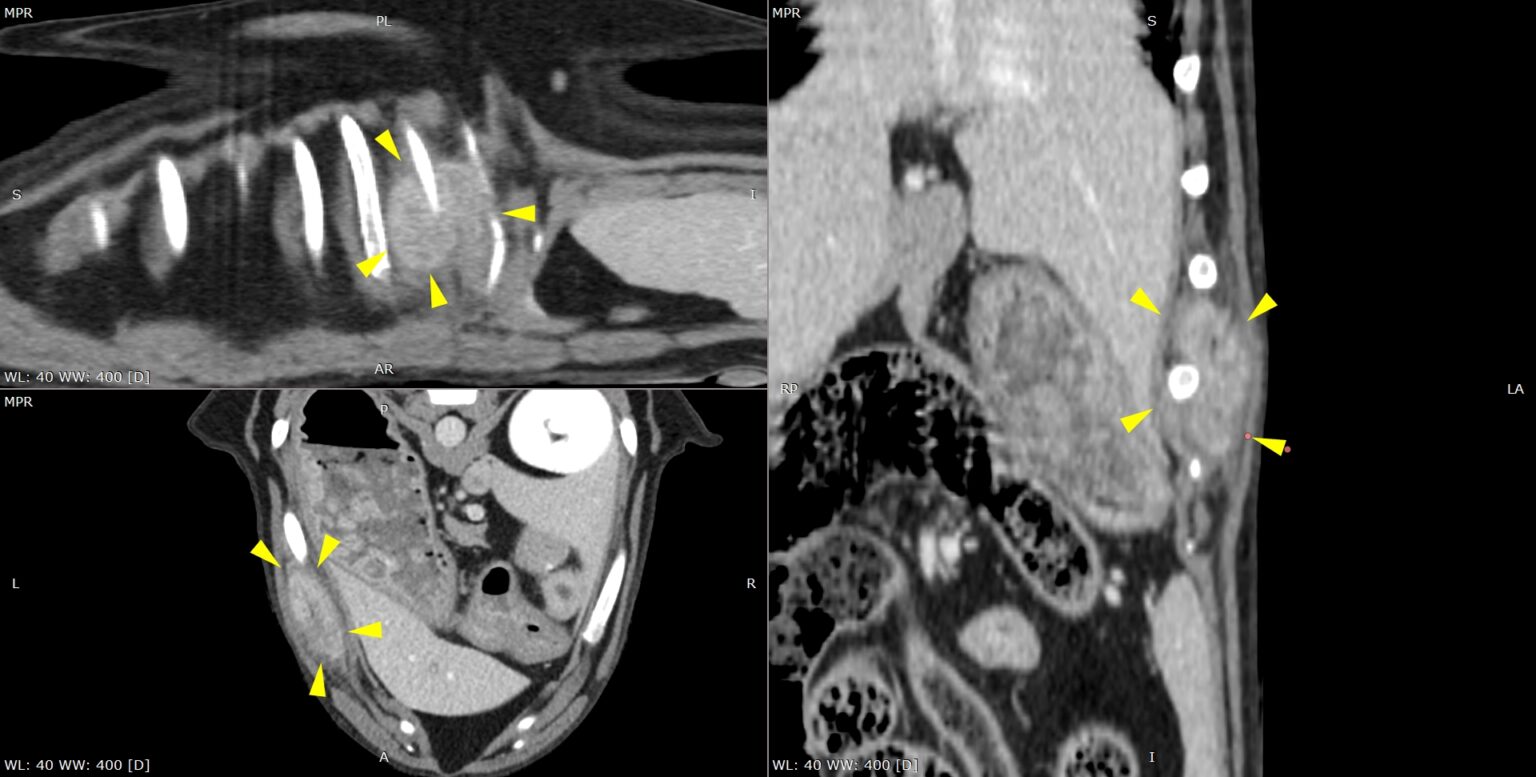 Les reconstructions dans les trois plans mettent en évidence une masse tumorale infiltrante développée à partir des côtes gauches, avec atteinte des tissus mous adjacents et déformation locale de la paroi thoracique, comme indiqué par les flèches. Ce type d’imagerie permet une caractérisation précise de l’extension osseuse et extra-osseuse de la tumeur, indispensable à la planification d’une chirurgie oncologique large et raisonnée.