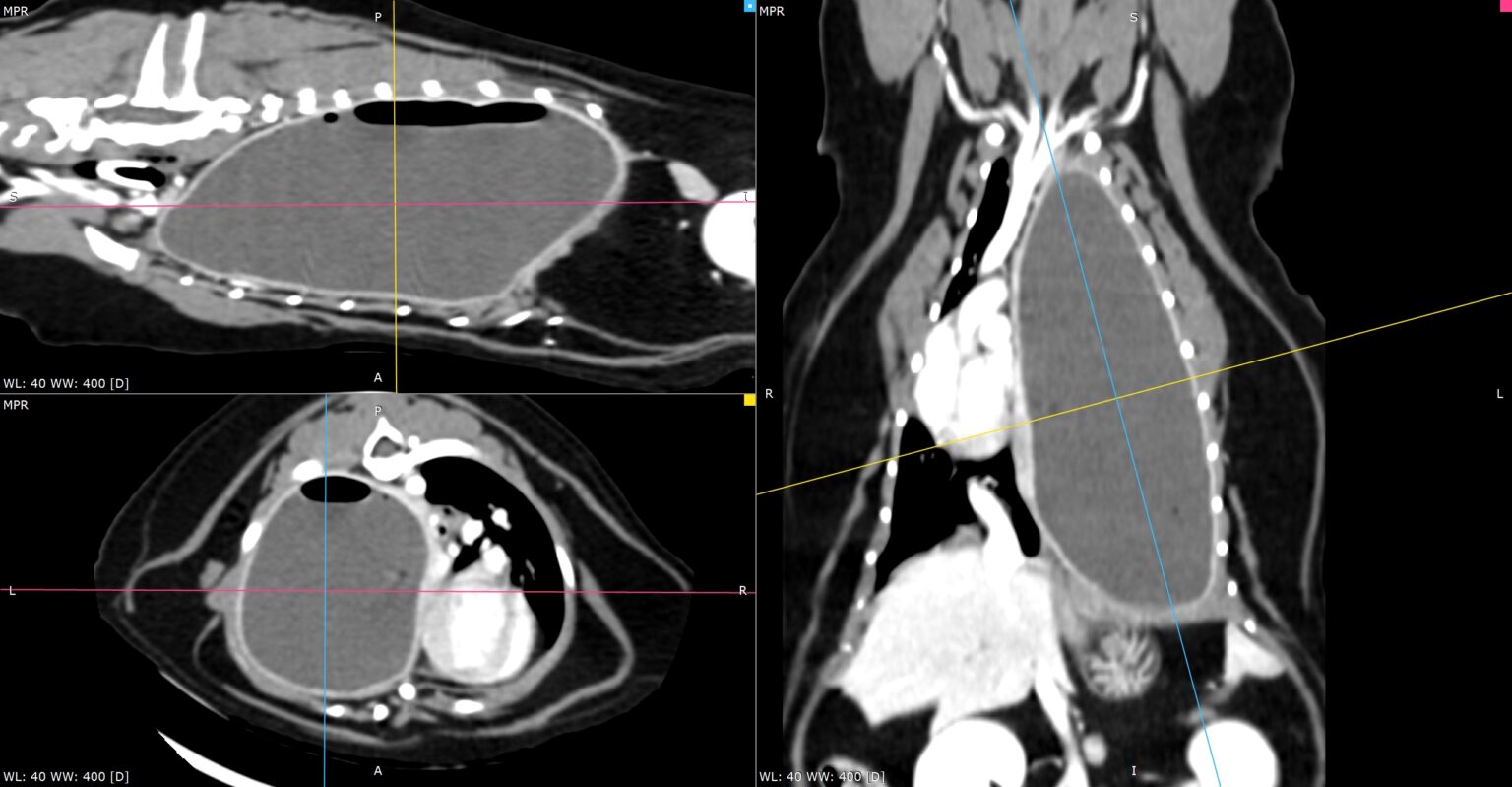 Scanner thoracique en reconstruction multiplanaire (MPR) illustrant un sarcome costal chez un chien.