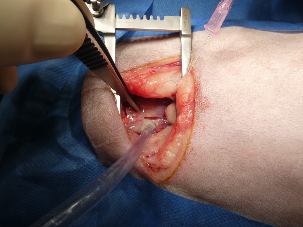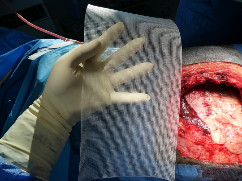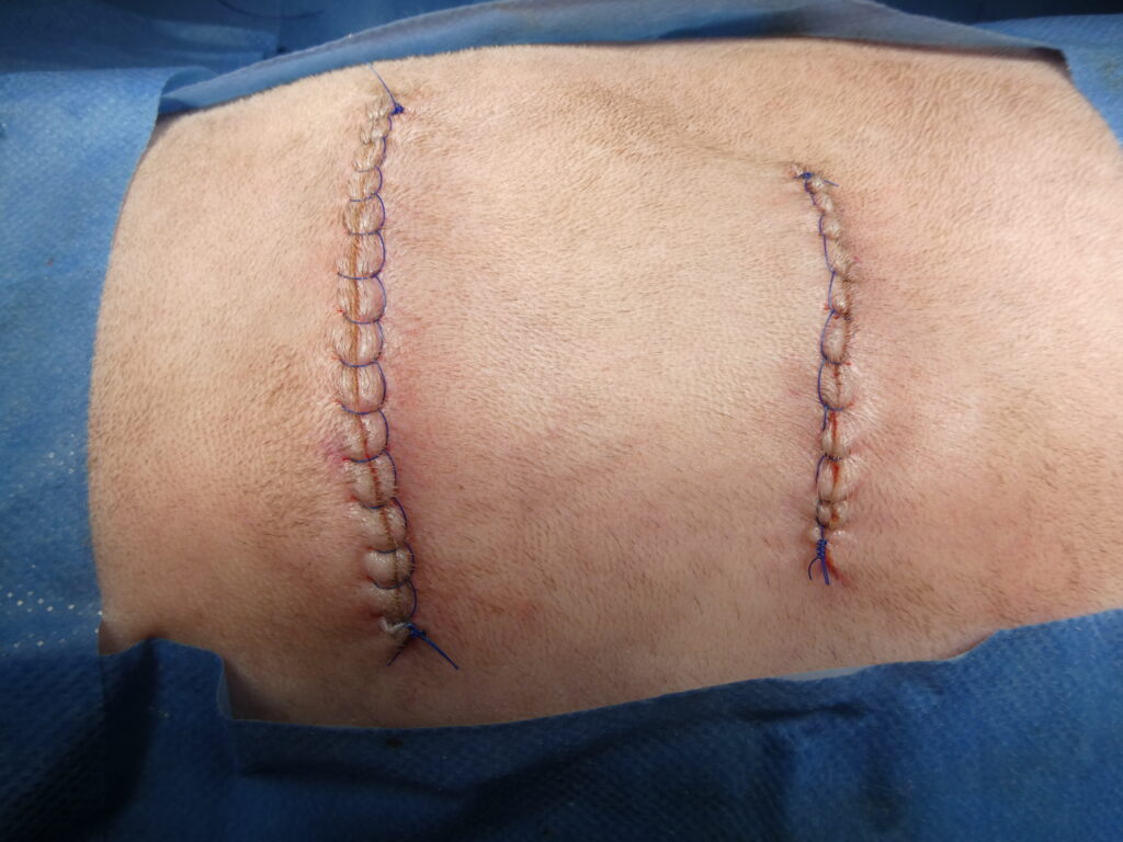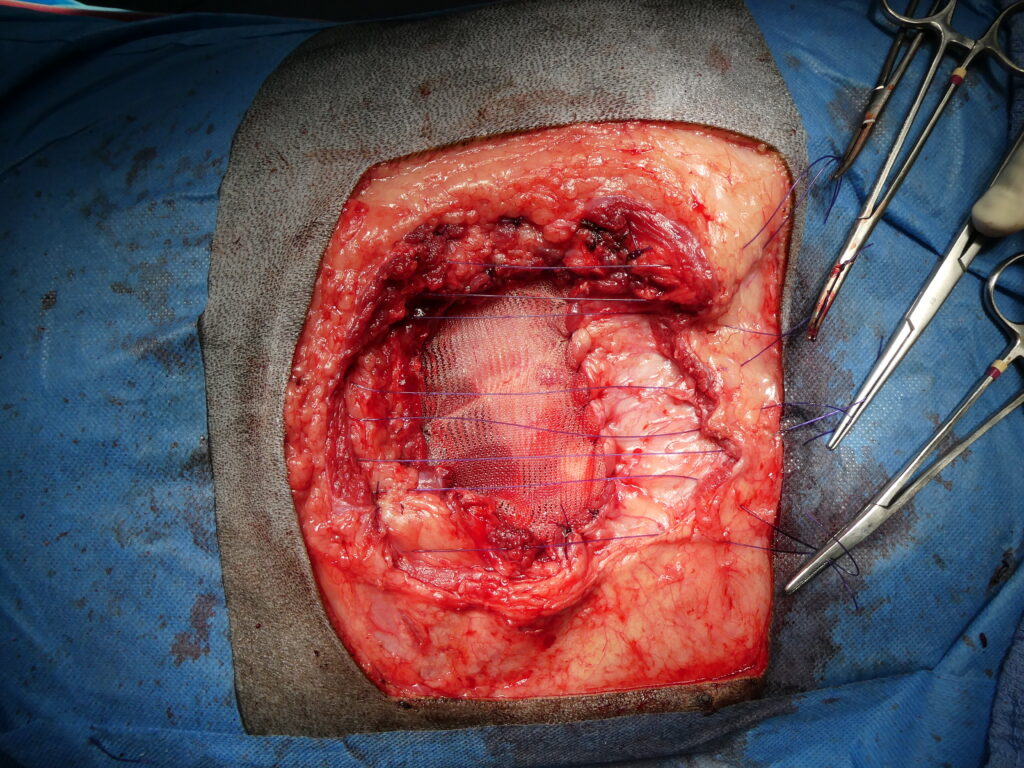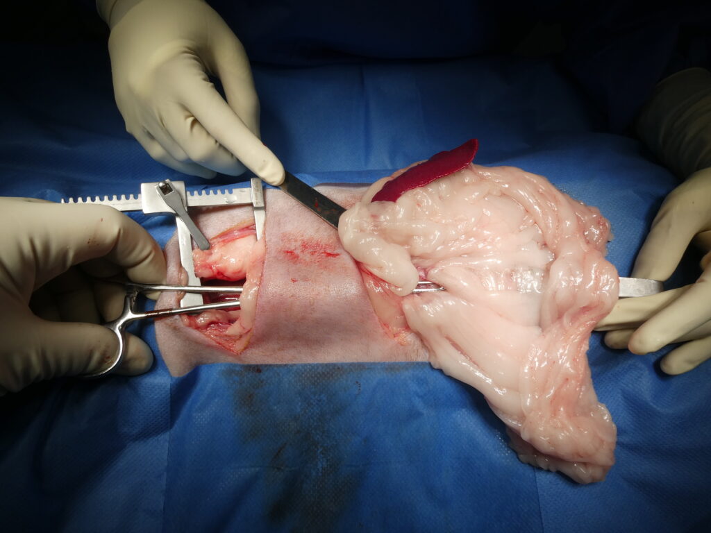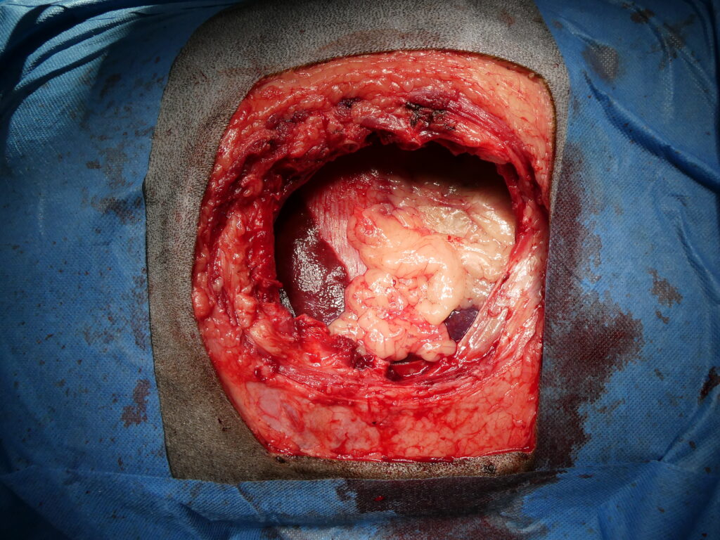 En haut à droite, réalisation d’une laparotomie abdominale afin de prélever un segment d’épiploon destiné à être utilisé comme drain biologique.
