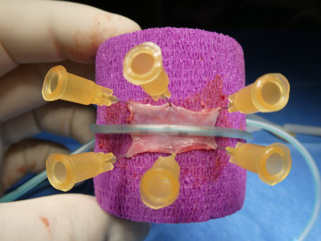 En haut à droite, préparation de la muqueuse après dégraissage complet et retrait des plans musculaires, puis mise en forme autour d’une sonde guide sur support afin de confectionner un néo-urètre tubulaire d’environ 15 mm.