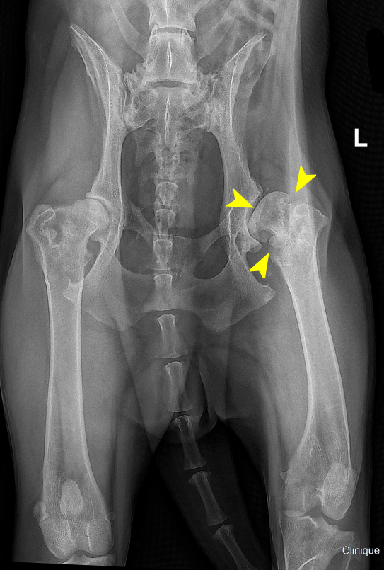 Radiographie de hanches chez un Berger Allemand de 5 ans présentant une coxarthrose bilatérale sévère, marquée à gauche par une déformation importante de la tête et du col fémoral, ainsi qu’une arthrose avancée.