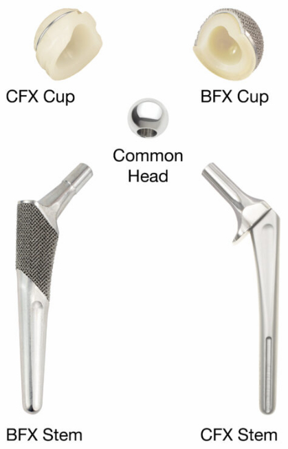 Exemples de montages possibles. Une PTH peut être impactée directement dans l’os (système BFX) ou cimentée (système CFX). Les deux systèmes sont prévus pour cohabiter dans toutes les configurations possibles : cup et stem BFX, CFX ou mélange des deux en fonction des paramètres mécaniques et biologiques du chien. Source : https://biomedtrix.com/total-hip-replacement/