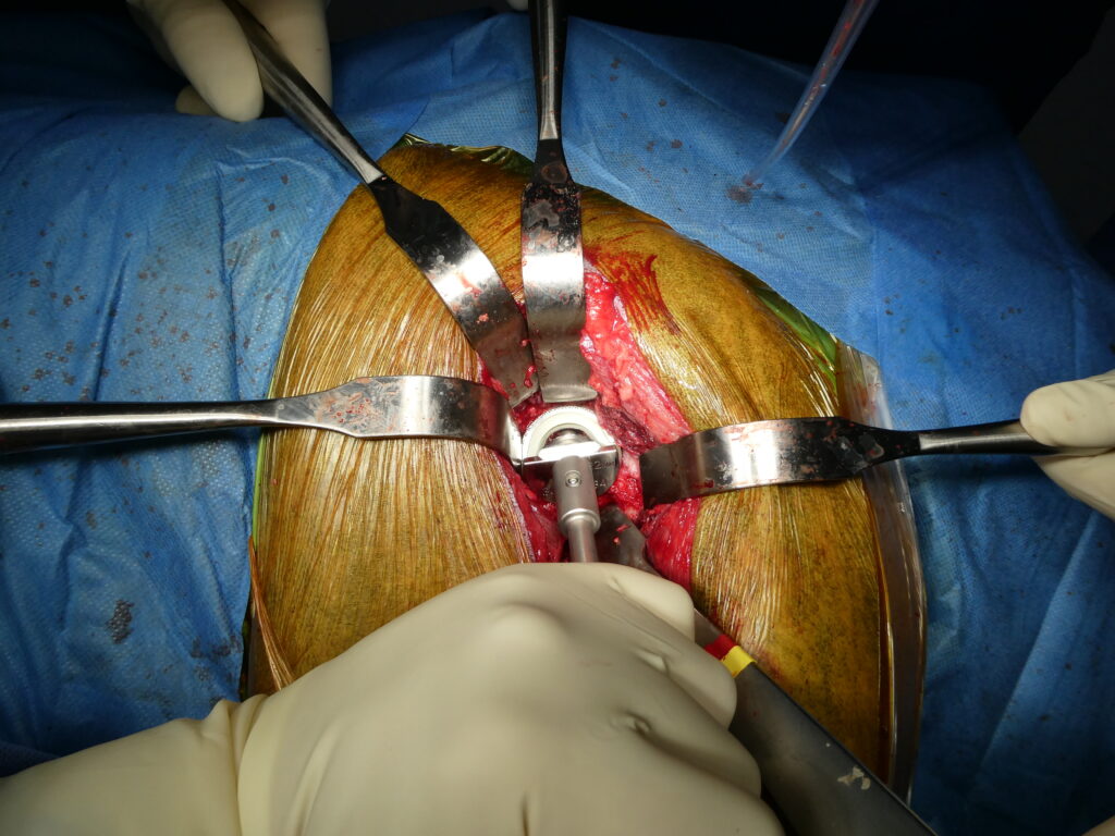 Le choix du type de prothèse et du mode de fixation est déterminé lors de la planification préopératoire, en fonction de la morphologie du chien, de la qualité osseuse et des contraintes anatomiques spécifiques.