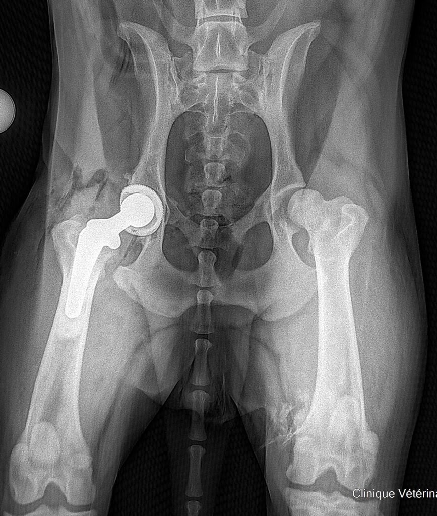 La hanche est une articulation essentielle chez le chien. Elle joue un rôle central dans la locomotion, en assurant la propulsion, la stabilité et l’endurance du membre postérieur. Soumise à des contraintes mécaniques importantes tout au long de la vie, elle peut être le siège de pathologies sévères entraînant douleur chronique et perte de fonction. Lorsque ces affections deviennent trop avancées pour être contrôlées efficacement par un traitement médical ou des solutions conservatrices, la prothèse totale de hanche constitue aujourd’hui une option thérapeutique fiable et éprouvée.